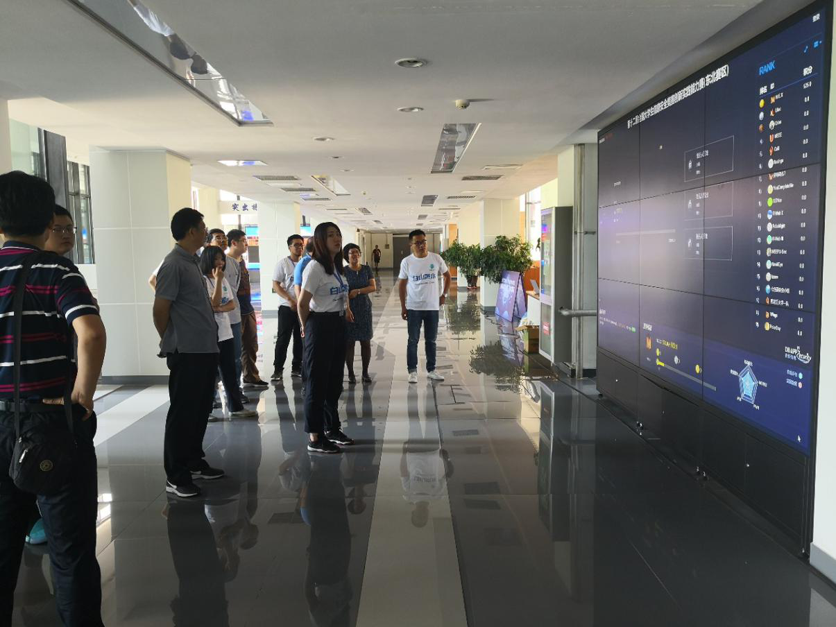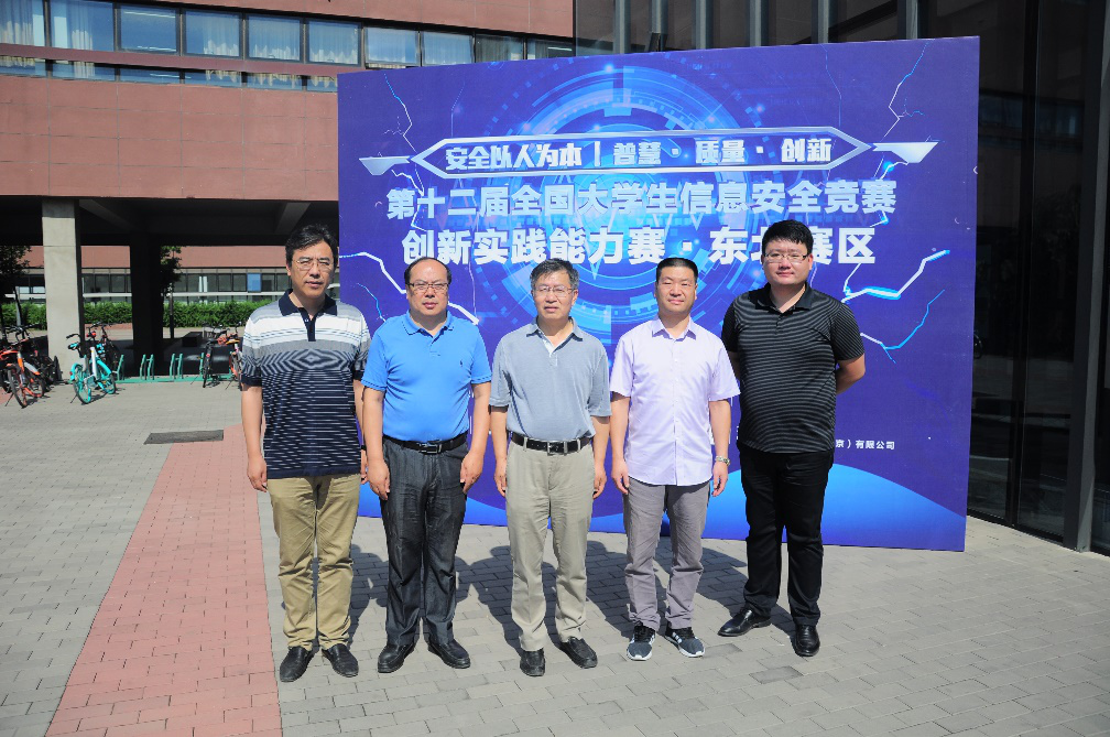 德赢官网Vwin领导与嘉宾专家合影(右起依次为杭州安恒信息技术有限公司东北大区总经理赵君,中科院沈阳自动化研究所尚文利研究员,德赢官网Vwin院长张斌教授,大赛组委会委员东北赛区负责人周福才教授,德赢官网Vwin副院长程维副教授)