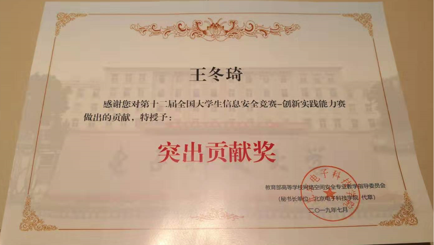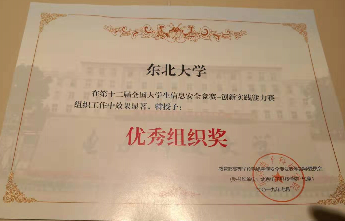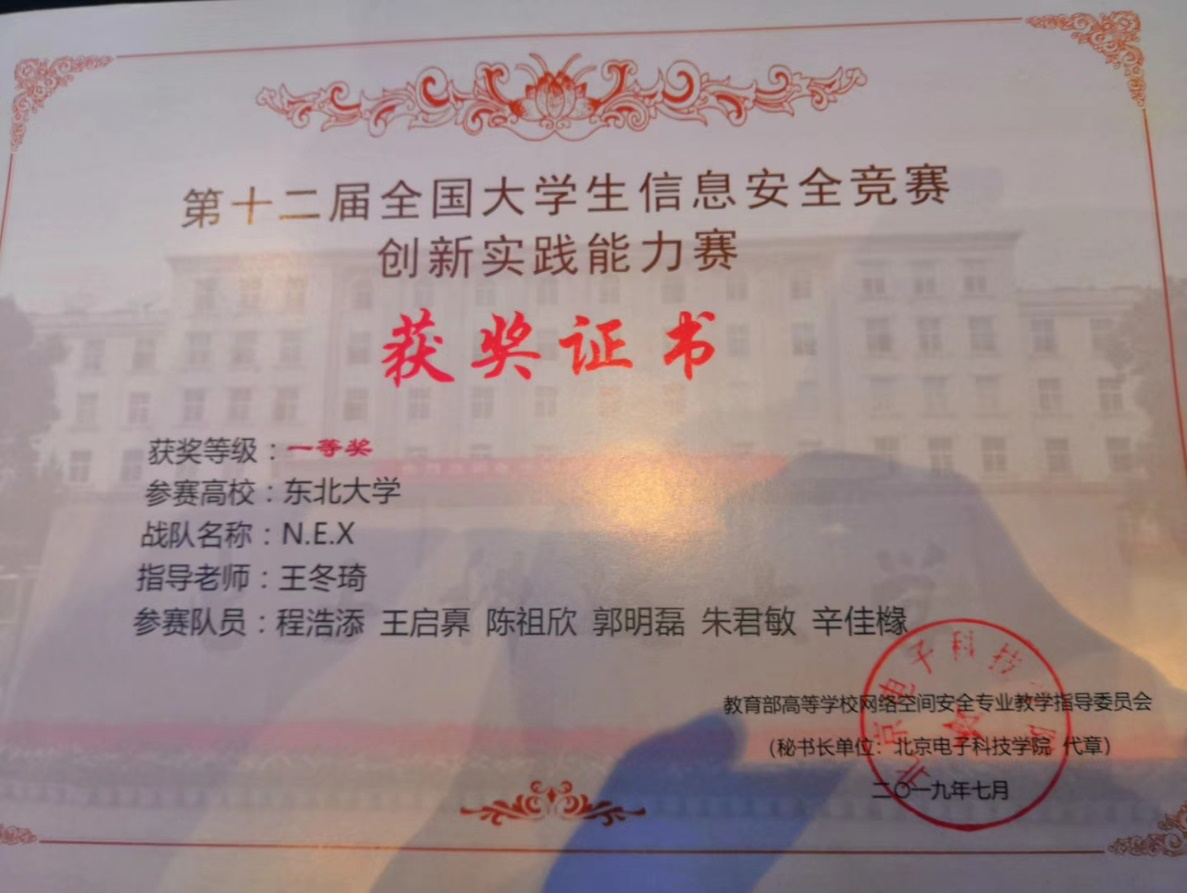 ‘全国大学生信息安全竞赛-创新实践能力赛’是目前国内最高级别的信息安全大赛之一,本届比赛全国共有455所高校,1316支队伍,6027名学生参赛,德赢AC米兰官网N.E.X战队以东北区冠军身份闯入决赛,并在总决赛80支队伍中最终成绩排名第12位,是我校乃至东北地区高校历年最佳成绩,德赢AC米兰官网因为在分区赛组织中的突出贡献被授予‘优秀组织奖’,N.E.X战队指导教师王冬琦老师被授予大赛的突出贡献奖。据悉,N.E.X战队不只面向计算机相关专业吸纳成员,全校所有专业学生都可以参与队员选拔。