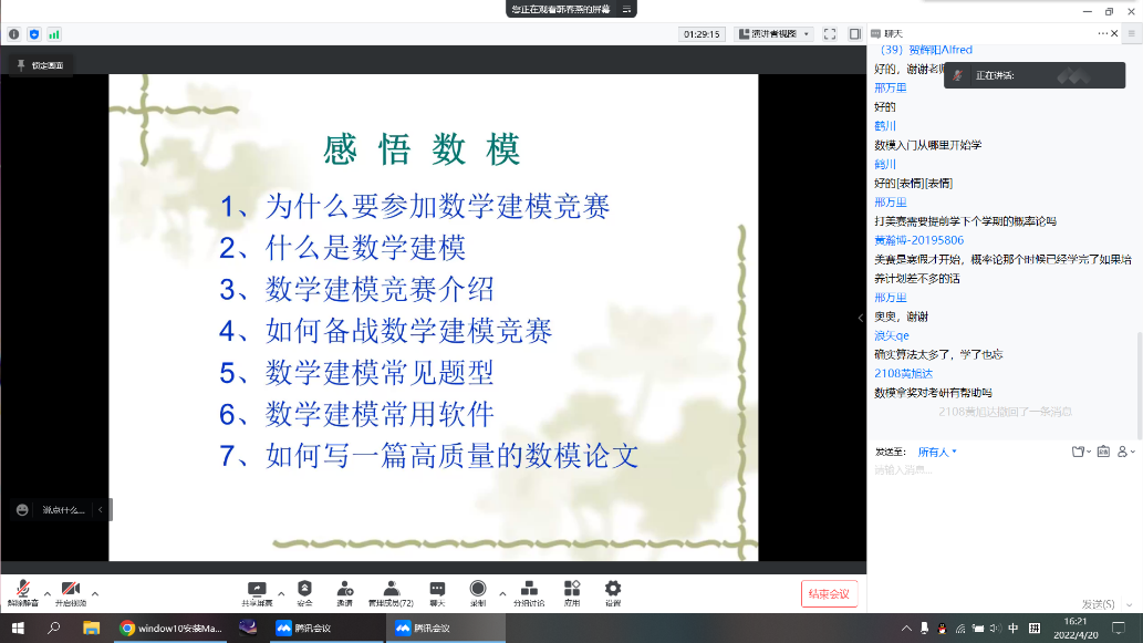 4月20日15时,德赢官网Vwin“精英讲堂·半月谈”活动通过腾讯会议线上举行。讲座以“感悟数模”为主题,活动邀请德赢官网Vwin副教授韩春燕担任主讲嘉宾,120余名学生收看讲座。
