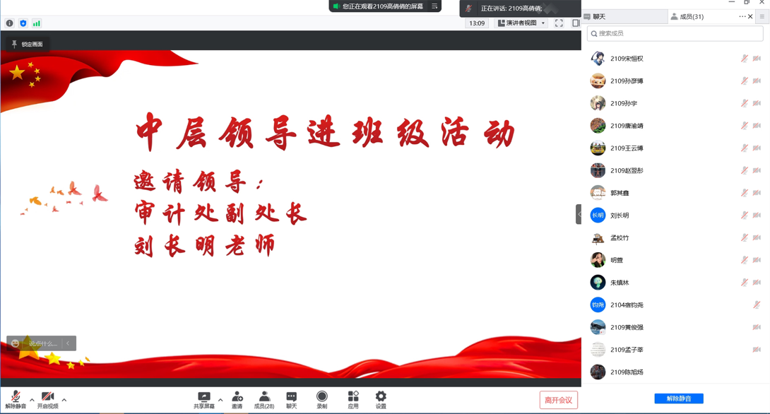 刘长明老师参加了计算机类Ⅱ2109班的“学习两会精神,争当青年标兵”主题团日活动,活动过程中老师对同学们的学习生活做出了富有建设性的讲话,并且给封闭在校的学生们以精神鼓励。