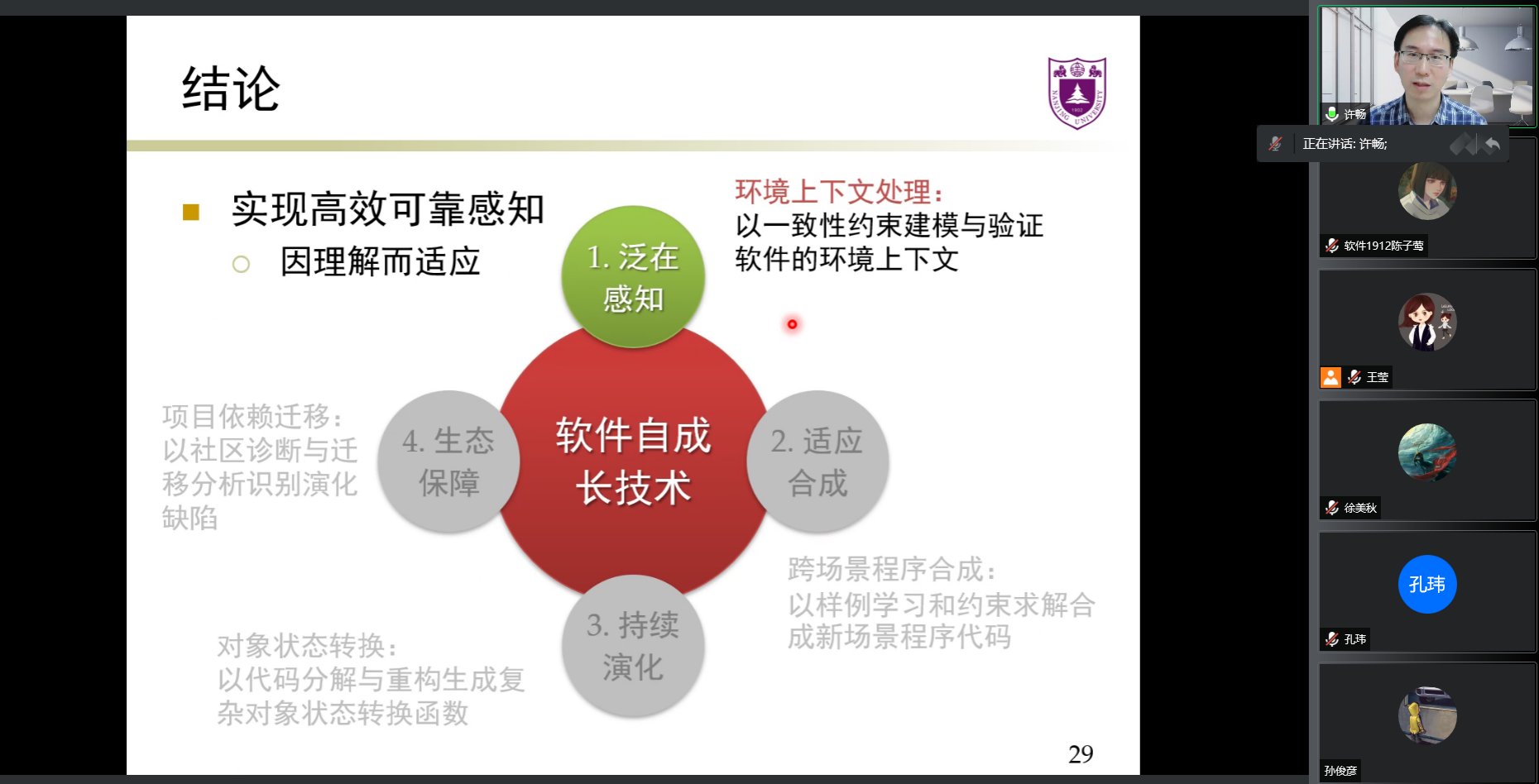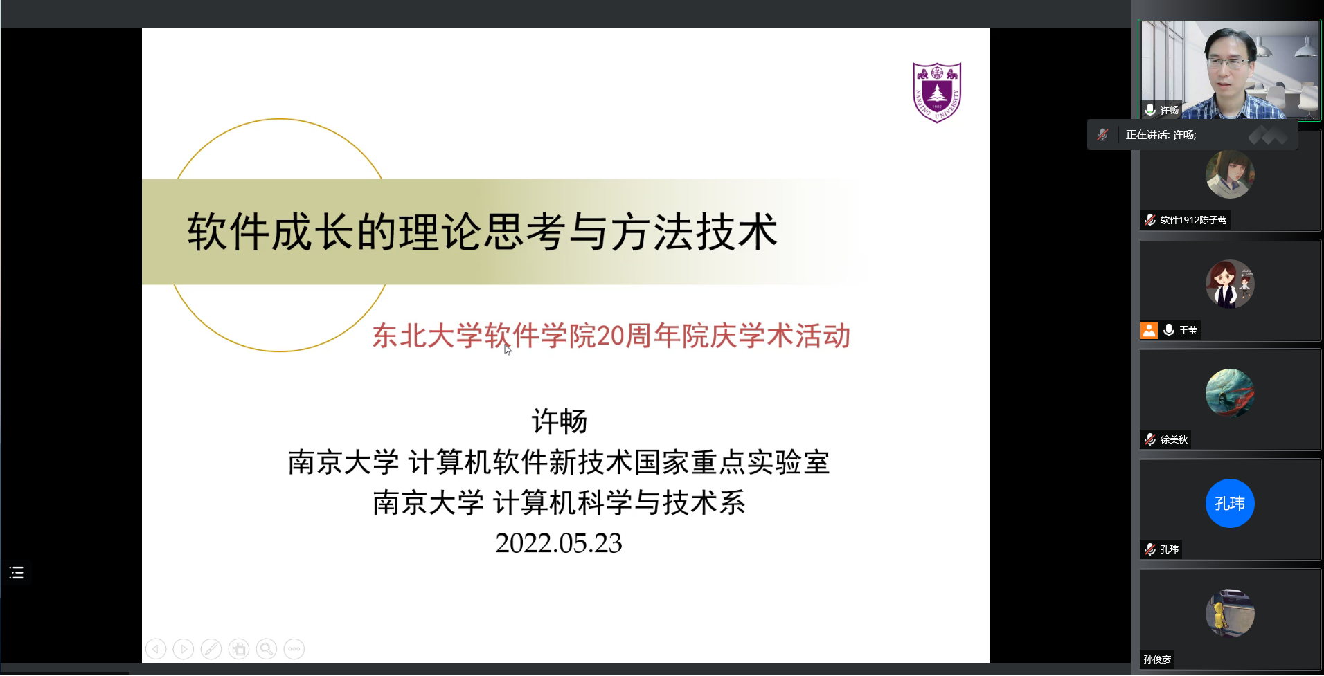 2022年5月23日下午,德赢官网Vwin“20周年院庆系列”讲座——“软件成长的理论思考与方法技术”在线上举行。邀请南京大学许畅教授,为德赢官网Vwin师生进行学术讲座。许教授曾获教育部长江学者特聘教授和新世纪优秀人才支持计划,在开放环境软件质量保障理论、方法与技术研究方面有非常高的学术造诣。本次讲座由院长助理王莹副教授主持,德赢官网Vwin本科生、研究生以及专任教师共计百余人参加了此次讲座。