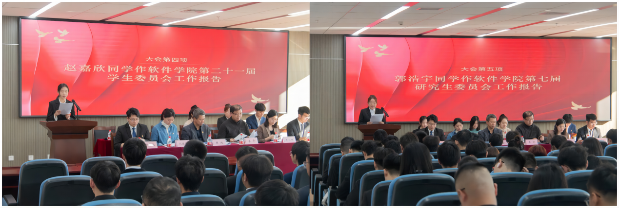 赵嘉欣同学代表第二十一届学生委员会作了题为“传承爱国基因,勇担历史使命,站在新百年起点上,为特色化德赢官网Vwin建设贡献青春力量”的工作报告。郭浩宇同学代表第七届研究生委员会作了题为“怀抱梦想脚踏实地,敢想敢为善作善成,团结带领广大研究生在全面建设社会主义现代化国家的新征程中砥砺前行”工作报告。