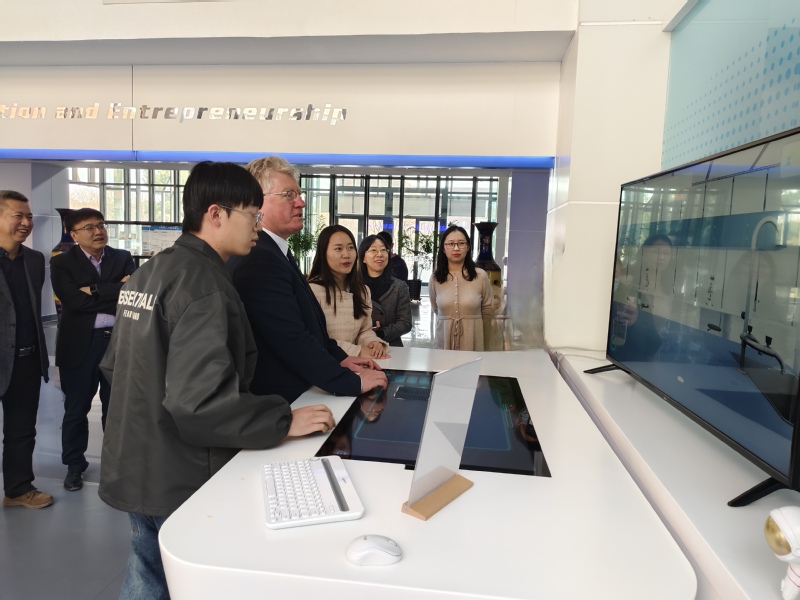 杨晓春对Dáire Keogh校长一行的到访表示欢迎,在参观学院的过程中简要介绍了德赢官网Vwin的发展历程、人才培养体系、师资力量及国际合作等情况,带领Dáire Keogh校长一行参观了泛虚拟现实人才培养与创新中心、智能软件开发技术研究所和德赢官网Vwin创新创业成果体验中心,并在体验中心展演了学生优秀创新创业项目。