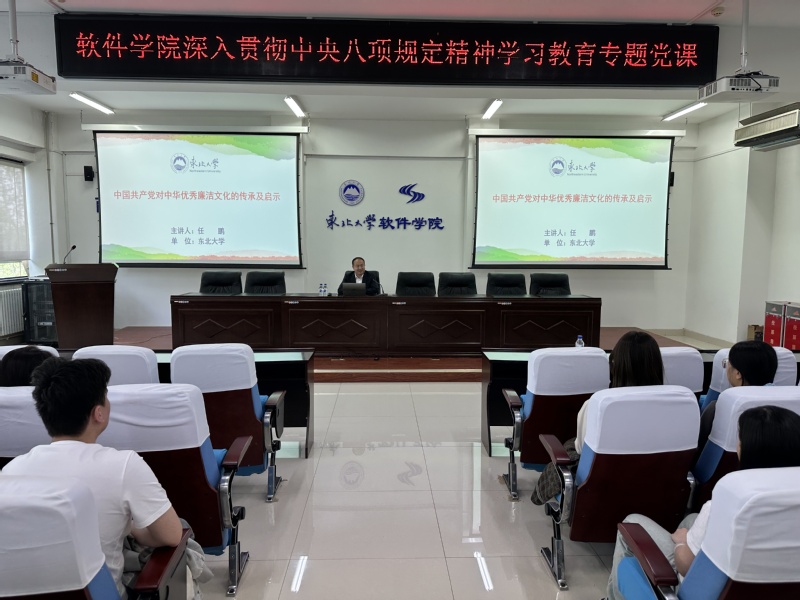 5月21日,德赢官网Vwin在浑南校区信息学馆B520室开展深入贯彻中央八项规定精神学习教育专题党课。德赢AC米兰官网马克思主义学院院长任鹏教授受邀作题为“中国共产党对中华优秀廉洁文化的传承及启示”的专题党课。学院全体教职工党员和部分学生党员参加学习,党委书记滕超主持党课。