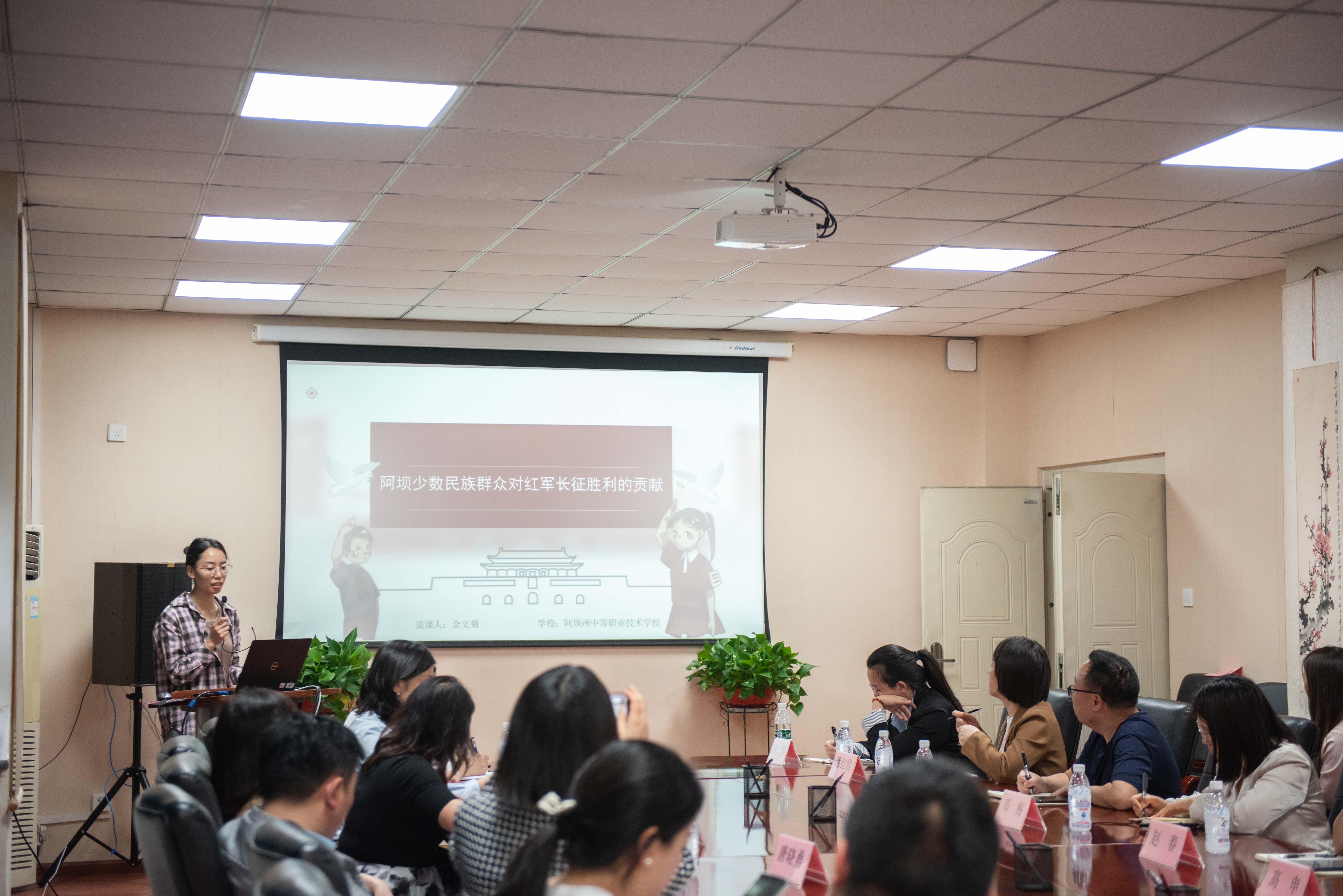 四川艺术职业学院的刘丽虹老师和阿坝藏族羌族自治州中等职业技术学校的金文菊老师分别以“爱国:中国人的心之所系,情之所归”和“阿坝少数民族群众对红军长征胜利的贡献”为主题进行现场教学设计展示。