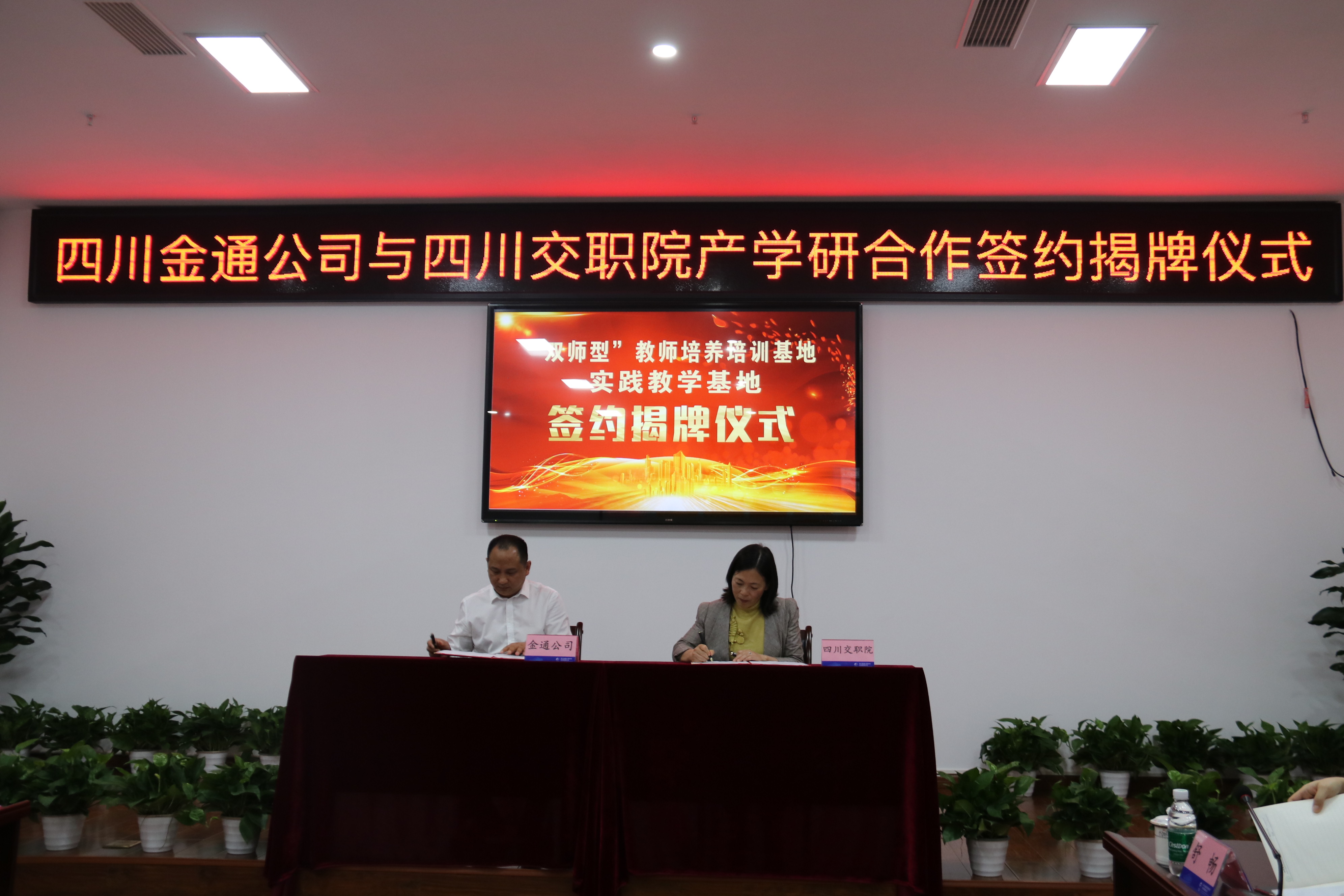 四川金通公司党支部书记、执行董事、总经理赵丹,副院长刘玉荣代表双方正式签署了《产学研合作暨“双师型”教师培养培训基地、实践教学基地战略合作协议书》,明确了合作宗旨、合作内容、保障机制等若干事项。随后,进行揭牌仪式,正式开启双方在深化产学研合作、协同培育人才、共建实训基地、共担科研项目等方面合作大门。
