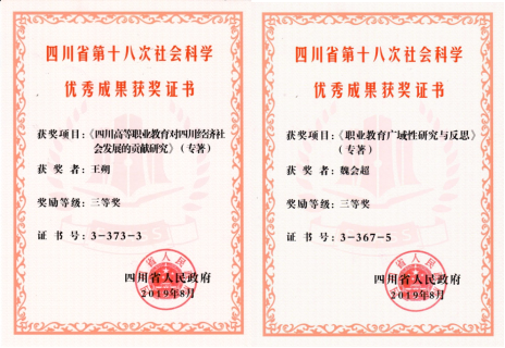 注重成果转化,引领职教发展。获省部级以上奖励20余项,在四川省近四届省级社科评奖中位居高职院校榜首,在国家(四川)教育教学成果奖评选中位于绝对领先位置。支撑了200余项省级教学成果奖,支持了322人次荣获近两届四川省教学成果奖,对四川职业教育教学改革作出了重大贡献。以科研为驱动力,推动研究成果转化,促进高职教育教学改革和人才培养质量提升效果凸显。